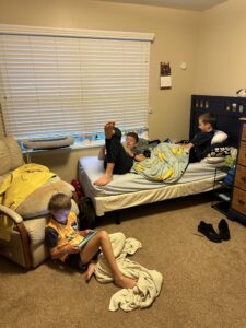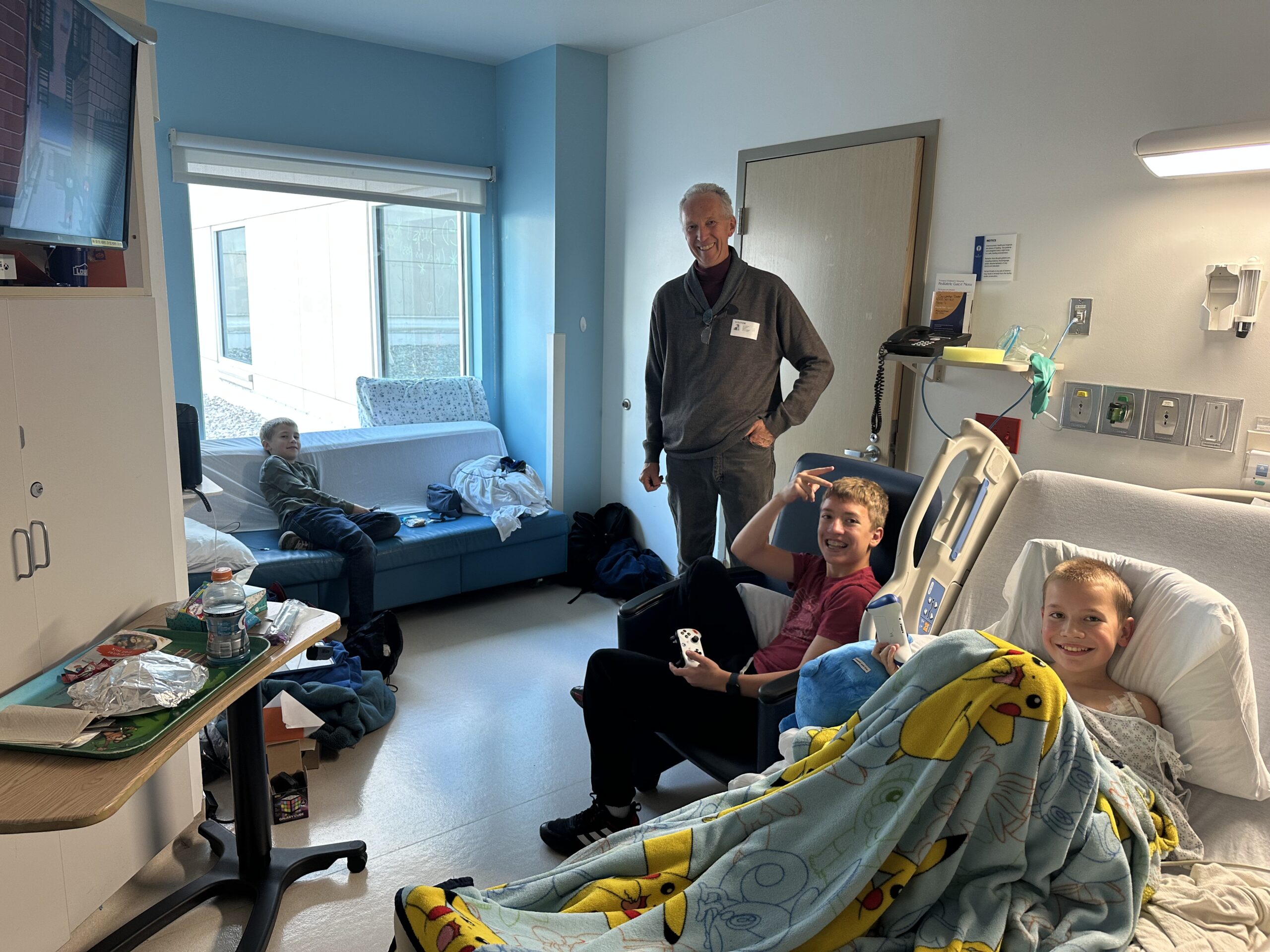 One of the beautiful things that came from our hospital stay was the confirmation that our boys really do love each other! It’s silly to think that they don’t, however the day to day fighting and bickering makes it hard to see what’s deeper. Andrew and Chris typically couldn’t even stand the sight of each other across the breakfast table, but the minute Chris was hurting Andrew was the first to offer his stuffed animals for support and turn his room over to Chris until he was well enough to climb the ladder to his bunk bed again. William tried to be stoic, but the stress of Chris being in the hospital weighed on him and there were a few tears. The boys had really never spent more than 1 night apart so this was a big deal for each of them in their own way. It was comforting as a parent to know we’re doing something right and perhaps one day they’ll all be good friends.