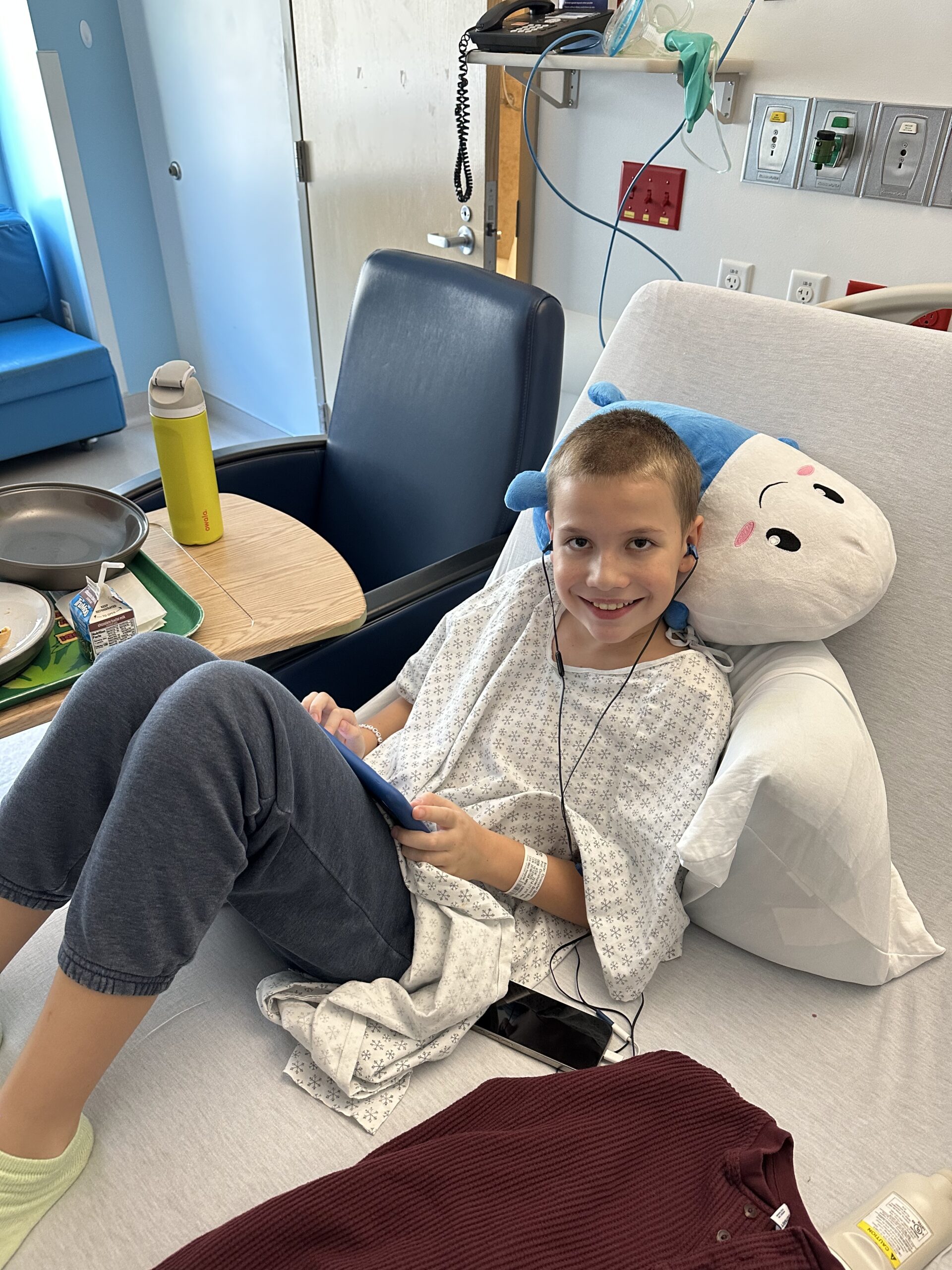 10/16 I got to be on speaker phone when infectious disease did rounds. They are very happy with progress. His culture from yesterday hadn’t grow anything yet (still could) but his earlier cultures grew FAST. They are hopeful today they’ll have a plan for which oral antibiotic it responds to and can trial that soon. Once oral antibiotics start he has to take it in hospital for at least a day to make sure he tolerates it well since we’re looking at 6 weeks. His inflammatory markers are trending down. We’re already a little lower than where he was at the pediatrician’s office last Thursday. Drain is out and ortho is letting infectious disease drive the bus. All good news! Thanks to friends for reaching out. Mostly I notice Chris gets very tired very fast and doesn’t have much appetite. Probably side effects of the heavy antibiotics. He’s had virtually no pain since surgery but we plan to get him moving and challenge him more now that the drain is out.